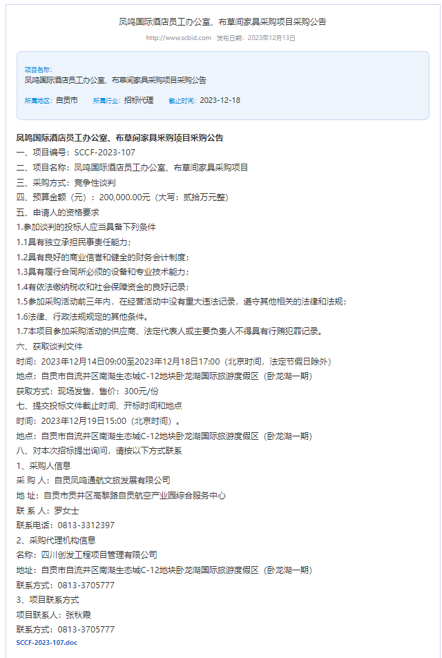 凤鸣国际酒店员工办公室、布草间家具采购项目采购公告