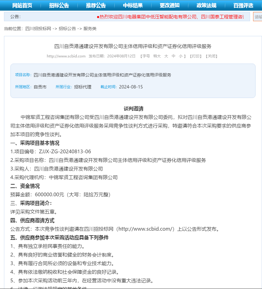 四川自贡港通建设开发有限公司主体信用评级和资产证券化信用评级服务谈判邀请
